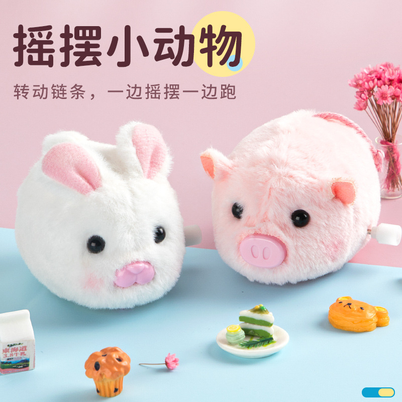楽吉児は小動物の子豚の人形のぜんまいのおもちゃを揺らしてウサギのぬいぐるみの赤ちゃんをシミュレーションします。