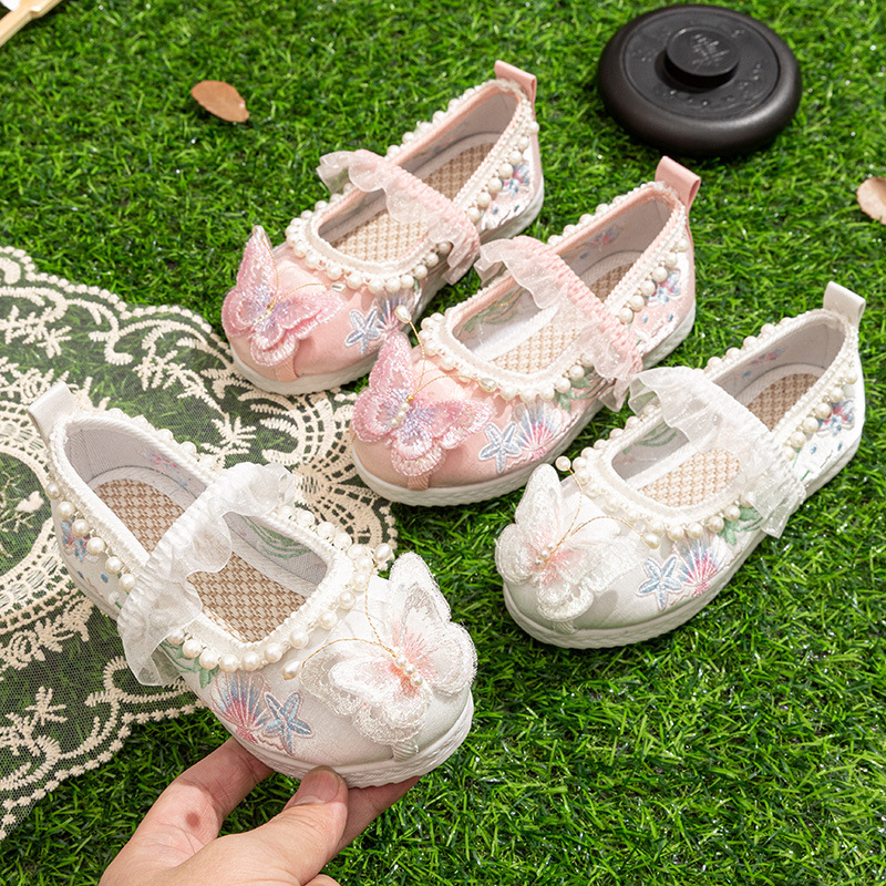 女の子の漢服の靴、古代スタイルの唐装、プリンセス子供用刺繍靴、刺繍布靴、夏のエスニックスタイルのメッシュサンダル