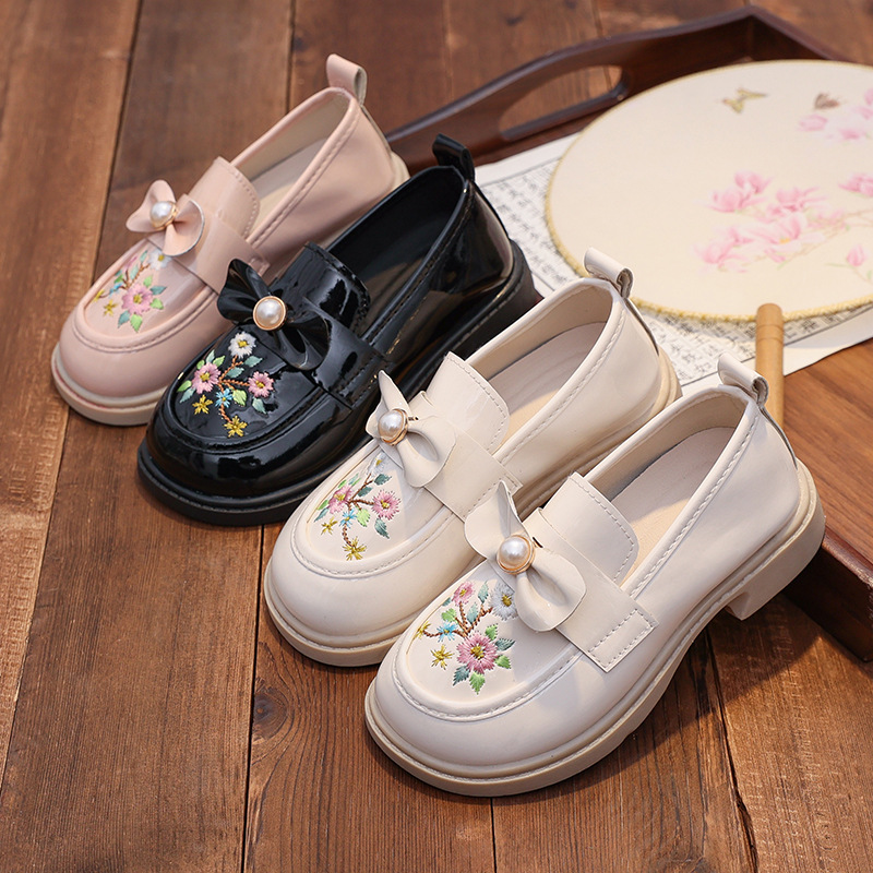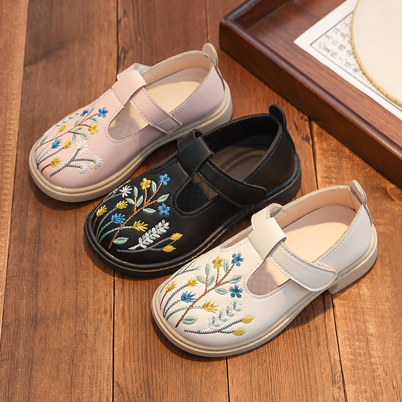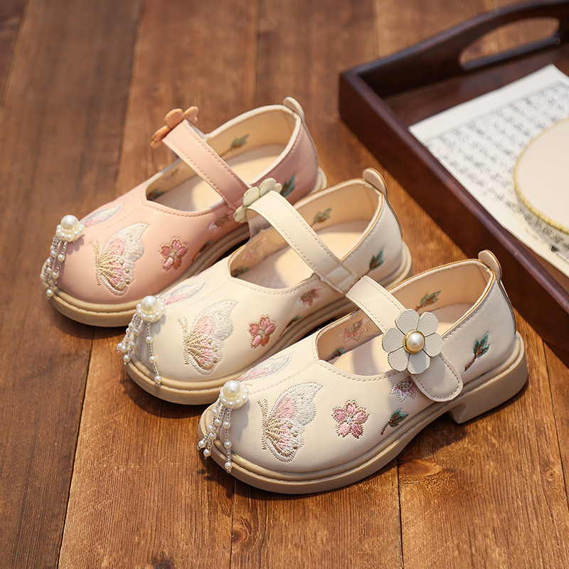 女の子用漢服靴、子供用古代衣装、レトロな中国風の手刺繍ソフトソール布靴、プリンセススモールレザーシューズ