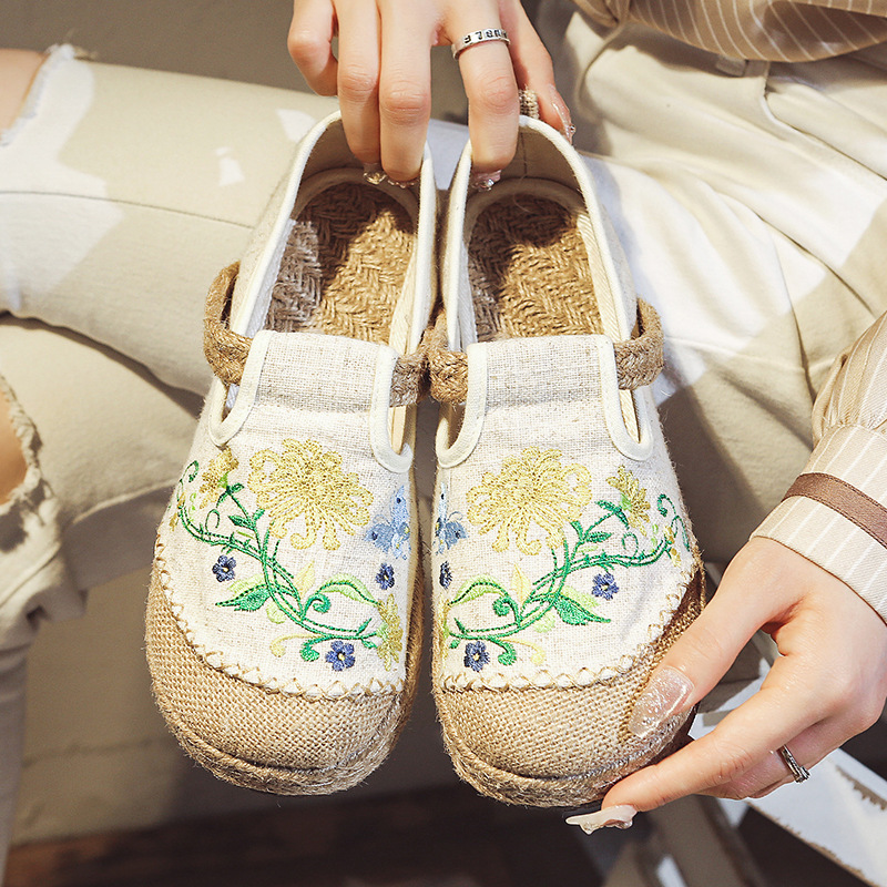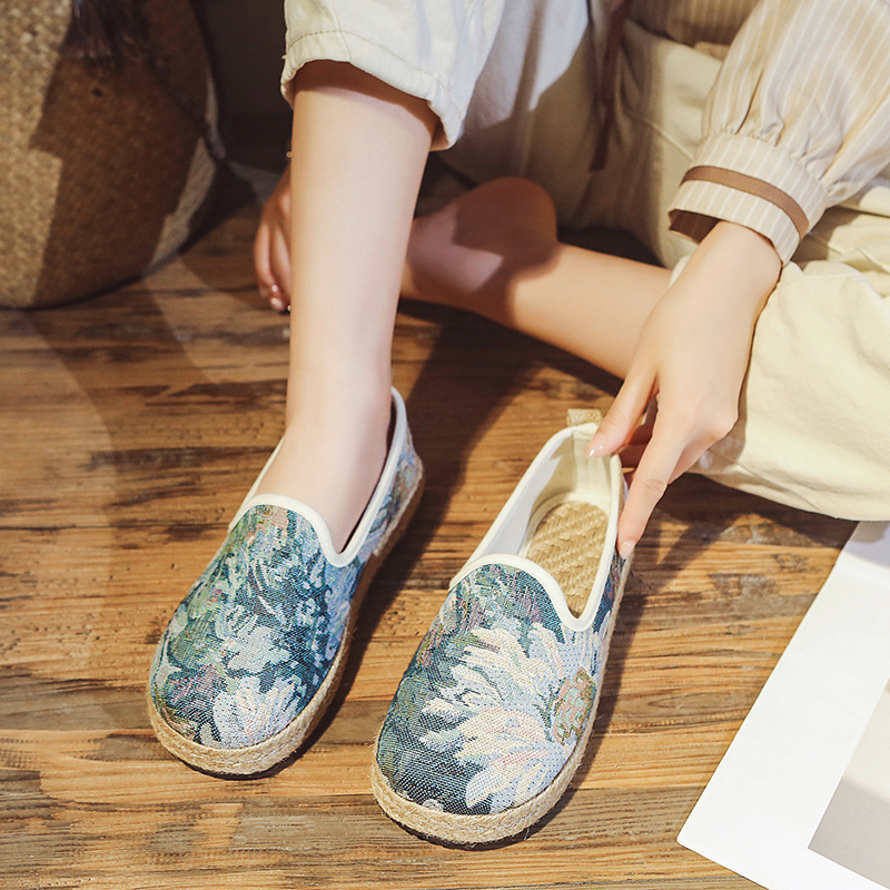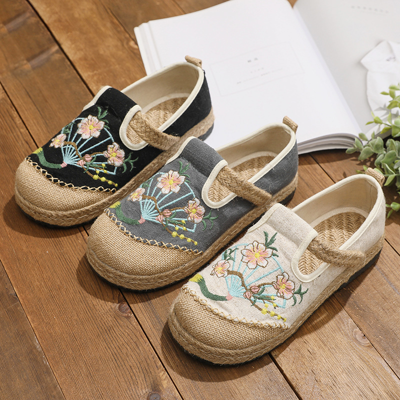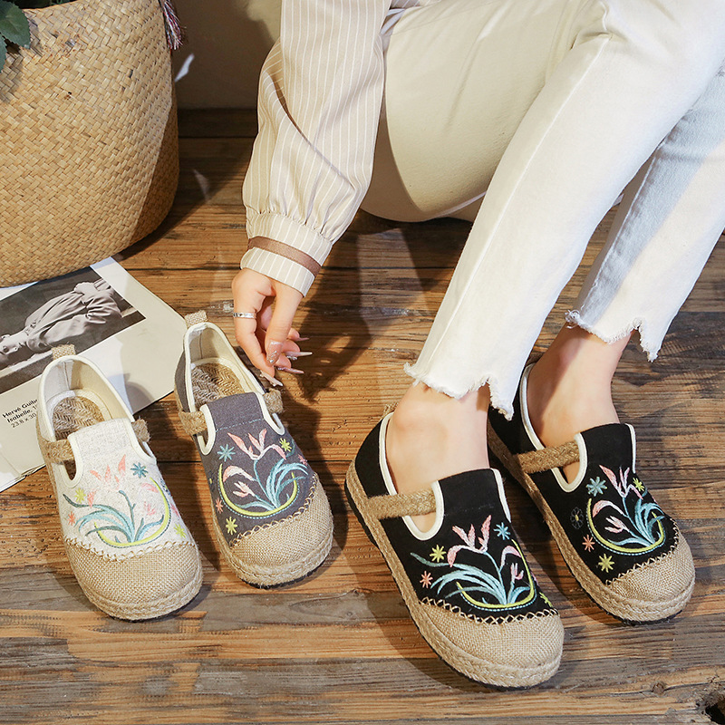 古い北京の布の靴の女性の亜麻の平底の刺繍の靴の復古のレジャーの怠け者の漁師の靴の民族の風の女性の柔らかい底の靴