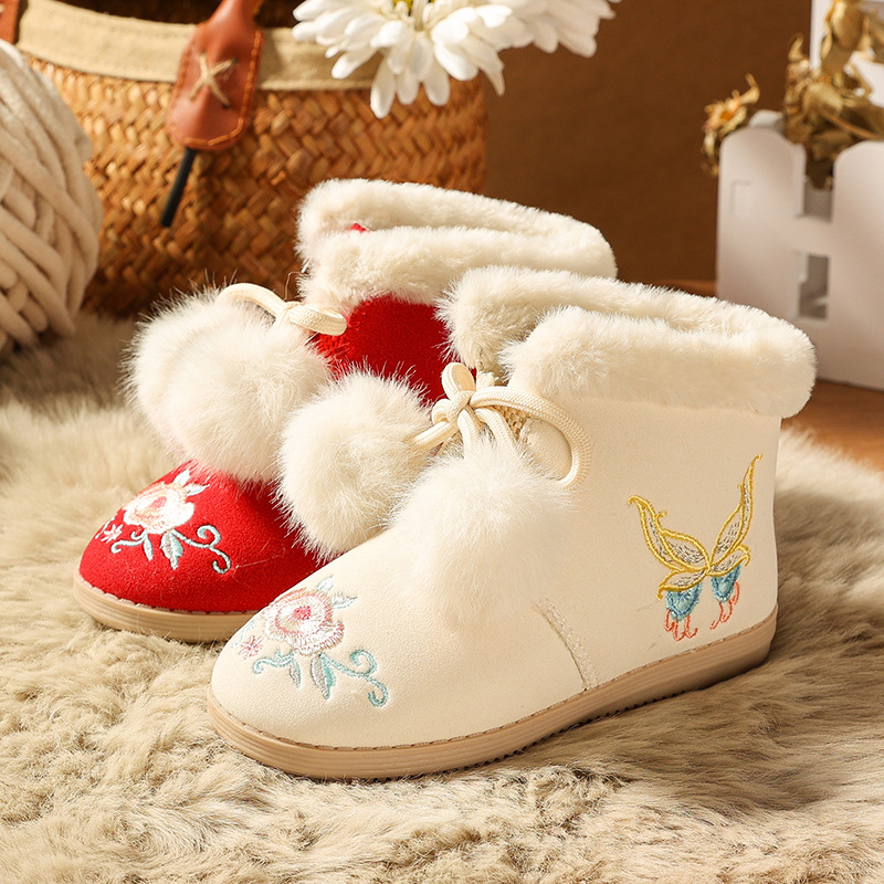 漢服の靴の女の子の古風漢服のブーツの子供の刺繍の靴の国風の小さい王女の時代の服の冬のベルベットの新年の靴