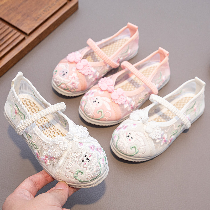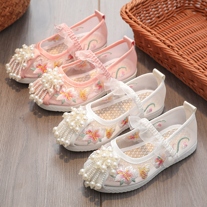 漢服の靴の女の子の時代の子供の刺繍の靴の中国の古風の布の靴の通気性のネットの糸の夏の民族の風のサンダル