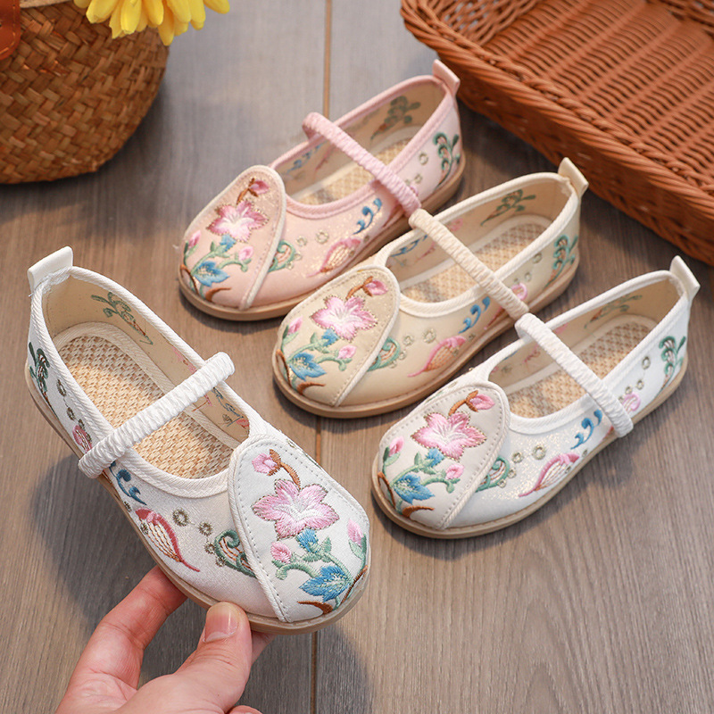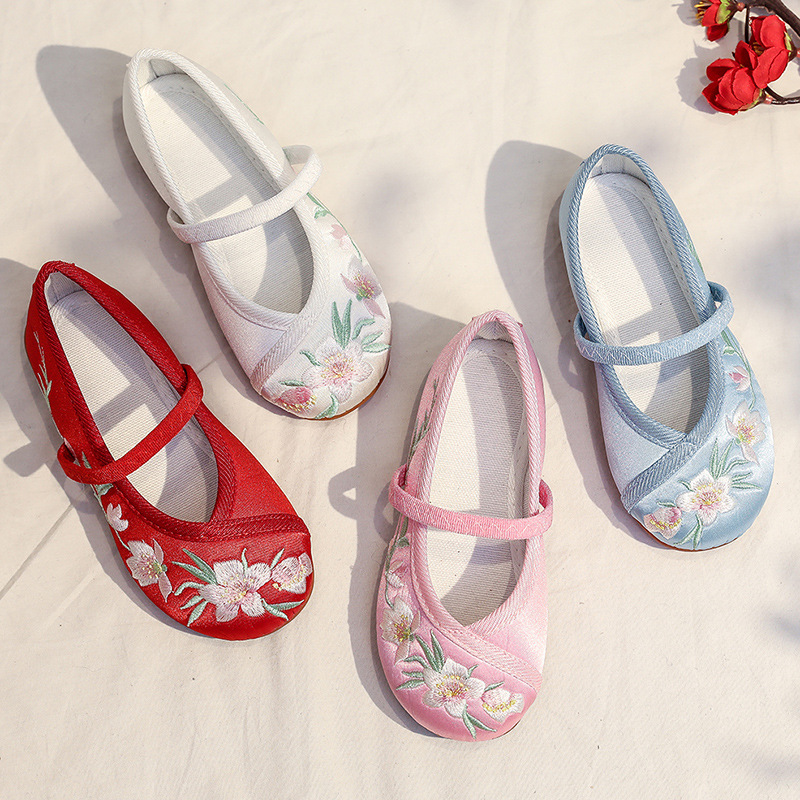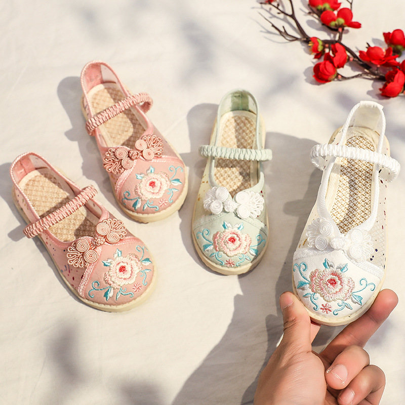 漢服の靴の女の子の刺繍の靴の子供の古風な民族の時代の国の風の小さい女の子の王女の靴の柔らかい底の小さい革靴