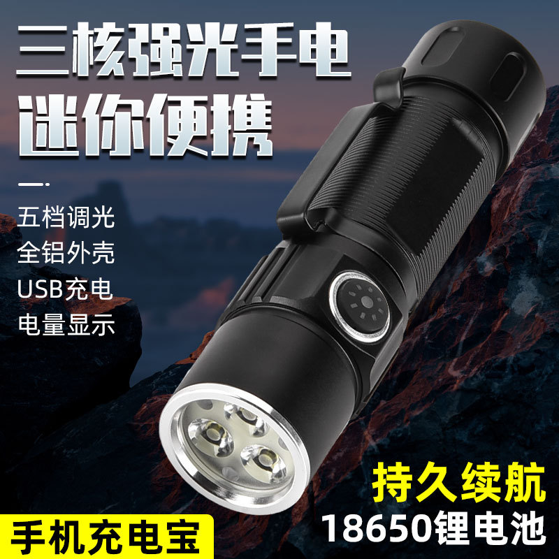 クロスボーダー出力led強光遠射usb充電三眼多機能クリップライト超明るいミニ携帯型懐中電灯