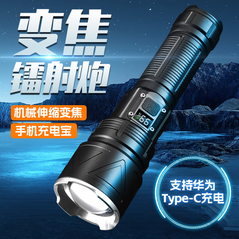 多機能白レーザー蛍光着天砲合金懐中電灯入力Type-C伸縮ズーム強光携帯電話充電
