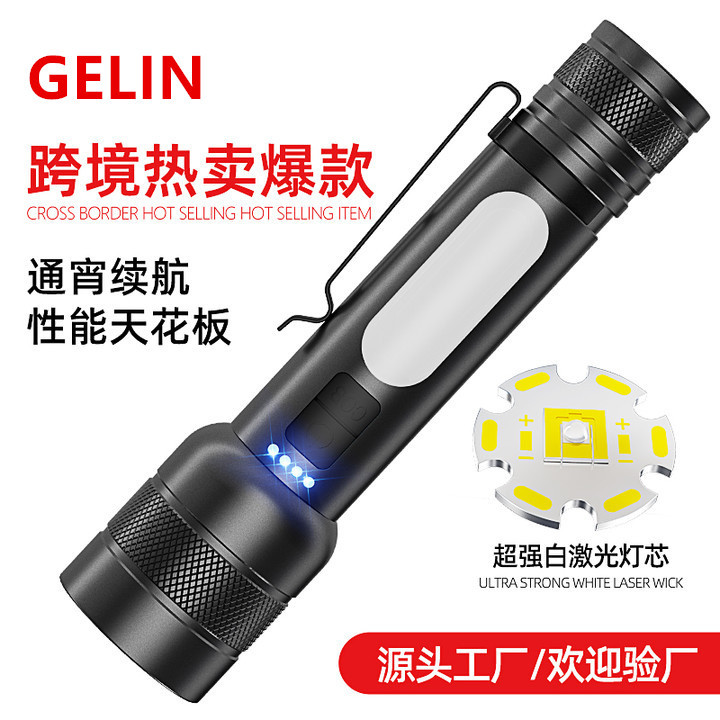 国境を越えた新型白レーザー充電懐中電灯led伸縮ズーム強光屋外cob側灯ペン付き懐中電灯