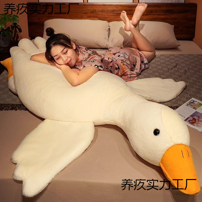 ガチョウは枕のぬいぐるみを抱いています。ガチョウのぬいぐるみは寝ています。