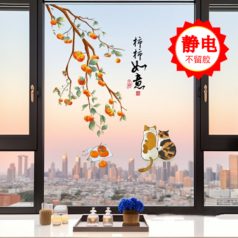 静電柿柿如意ステッカーバルコニー床から天井までの窓ガラスキッチン引き戸ステッカー装飾新築祝い両面窓装飾
