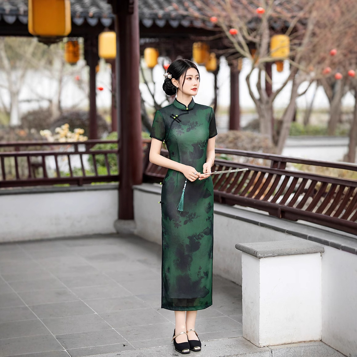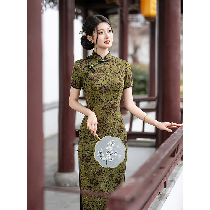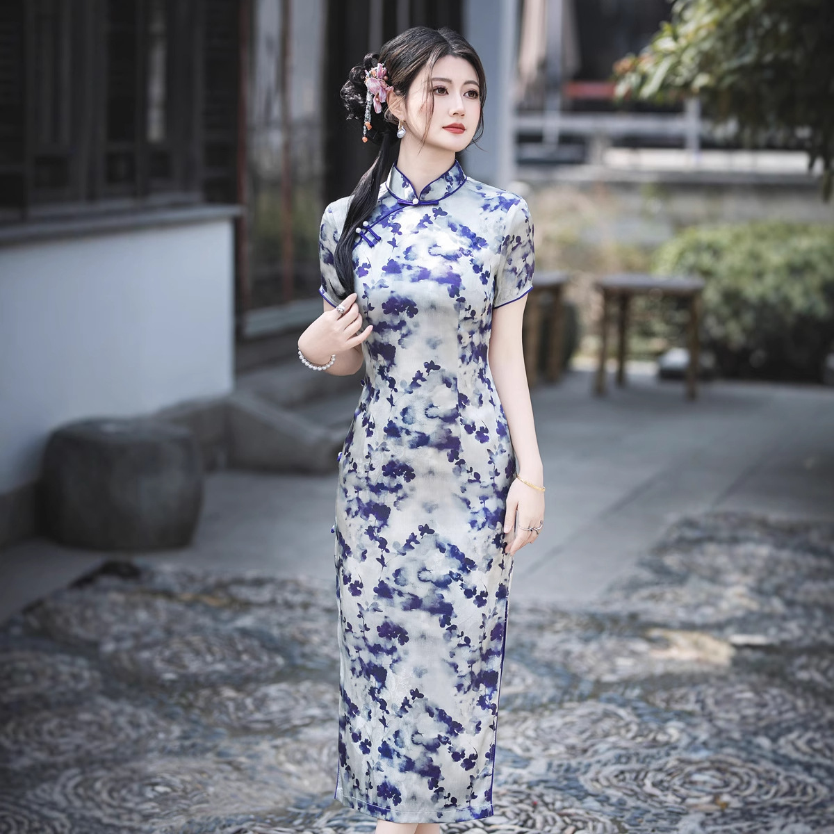 2025春夏新作シルク人綿ロングタイプチャイナドレスレトロ改良宴会写真半袖チャイナドレスワンピース