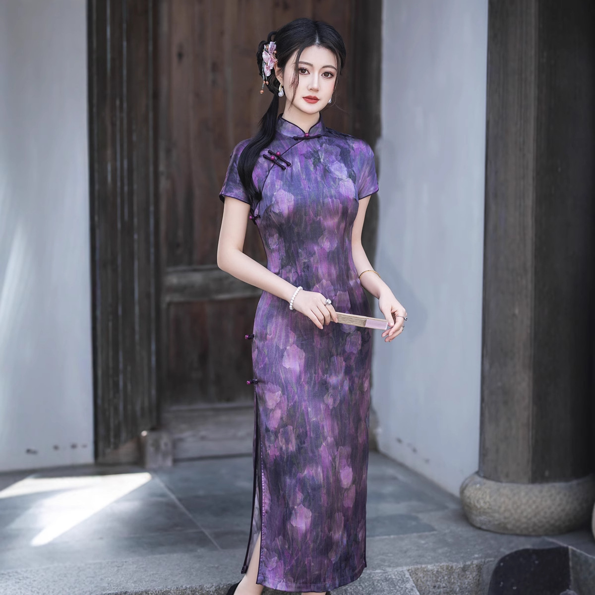 2025春夏新作紫長型中国式チャイナドレス文芸レトロ改良宴会写真半袖チャイナドレス