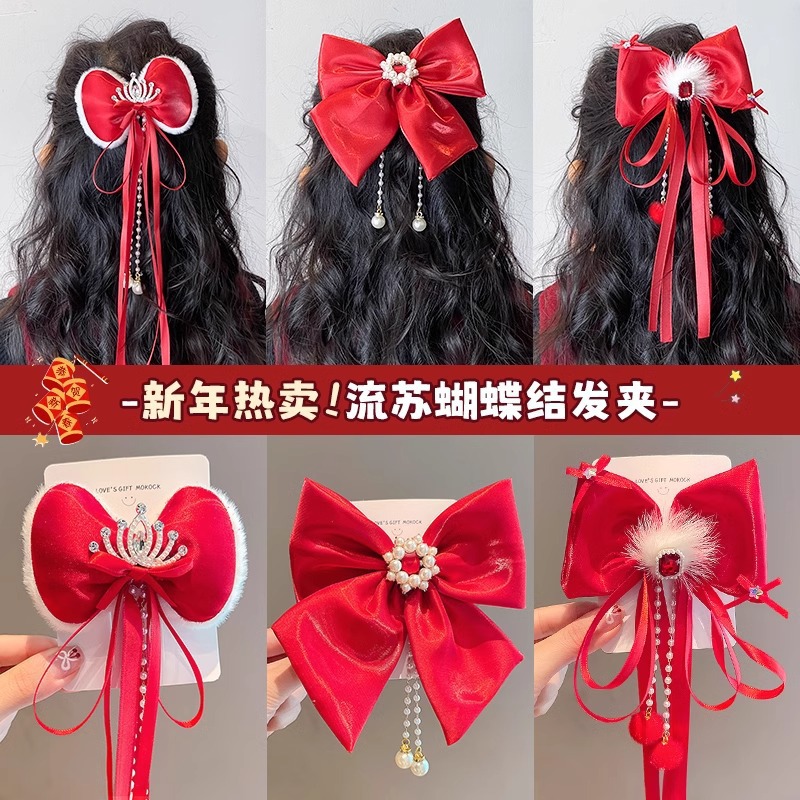 2025子供のヘアピンの蝶結びの頭飾りの女の子の赤い後頭部のカードの女の子の王女の赤ちゃんの新年の髪飾り