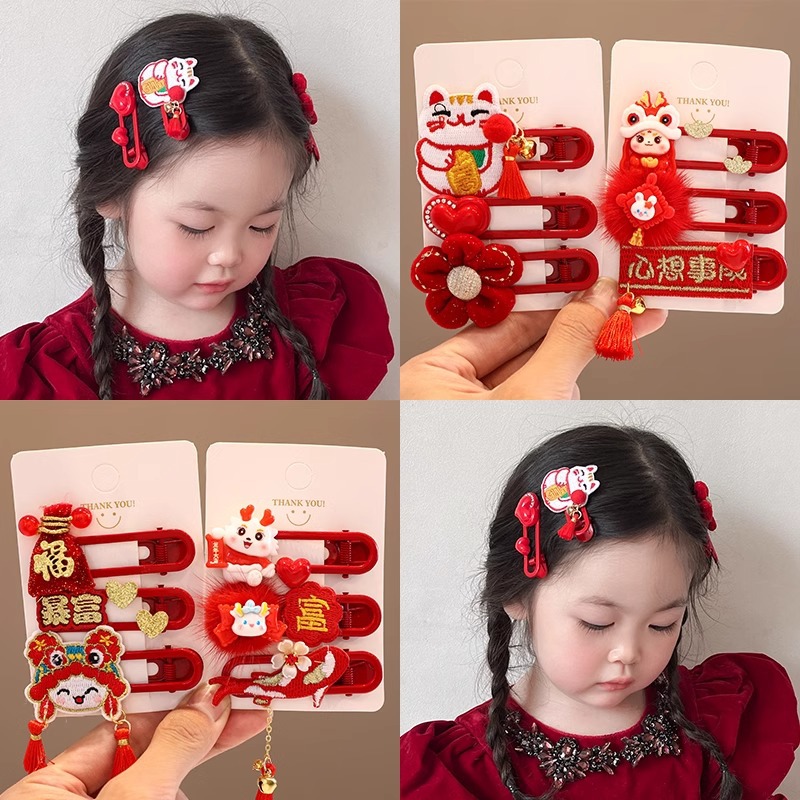 2024年子供の新年のヘアピンの赤いお祝いの女の子の中国風の正月の髪飾りの前髪7963