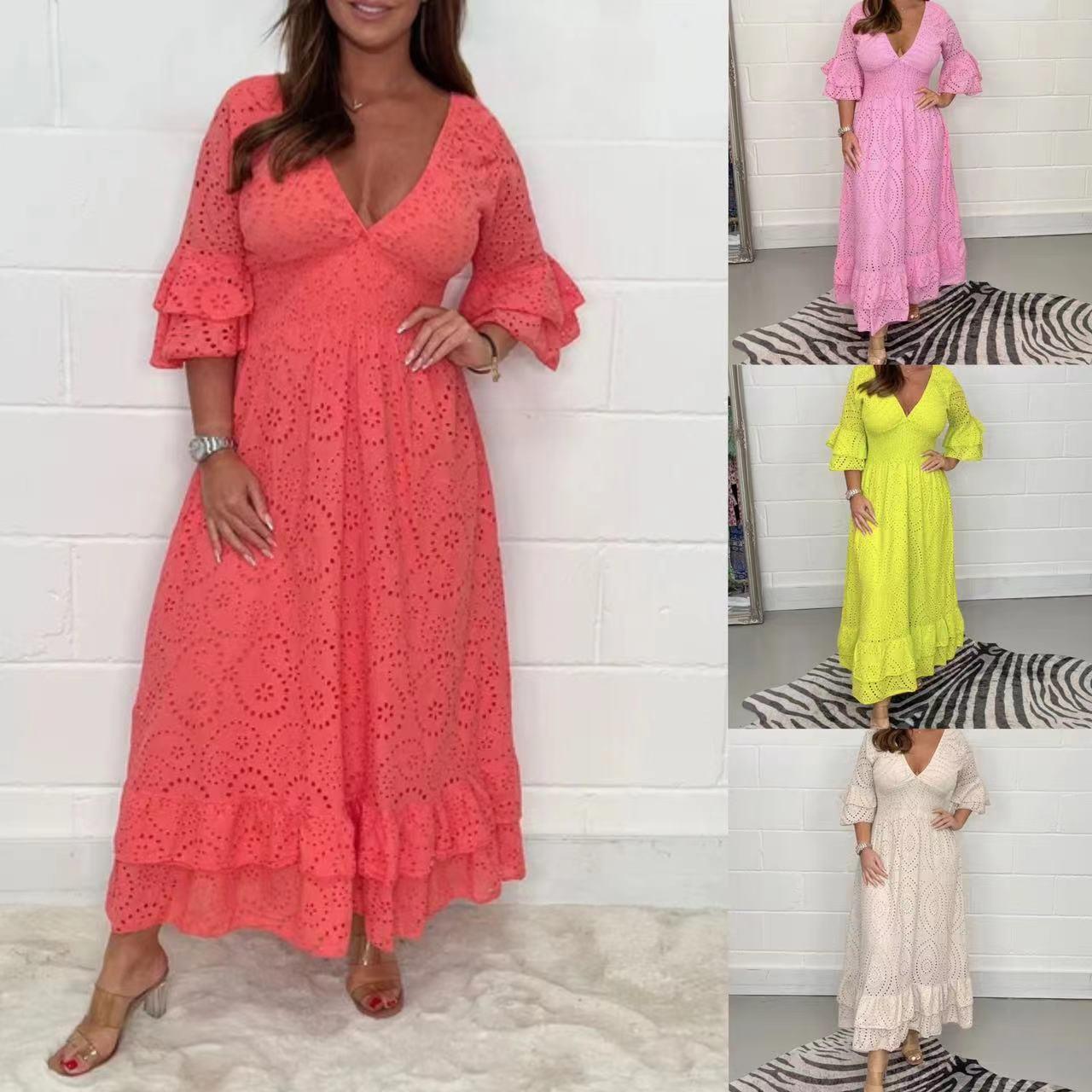 2023アマゾンwish独立駅クロスボーダー爆品女性快適ゆるい高腰刺繍純色vネックワンピース