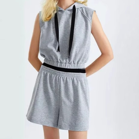 2025 ヨーロッパとアメリカのクロスボーダー Amazon 独立ステーション レディース ソリッドカラー フード付きスウェットシャツ トップ ドローストリング ショーツ 2 点セット
