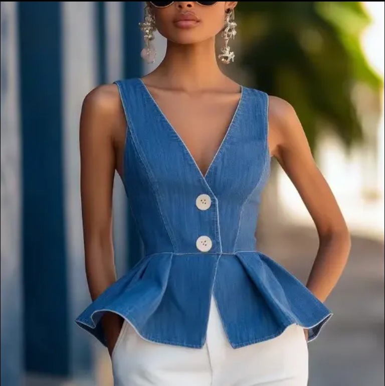 2025 ヨーロッパとアメリカのクロスボーダー Amazon AliExpress 新しいファッションノースリーブジャケットボタン付きフレアデニムシャツ