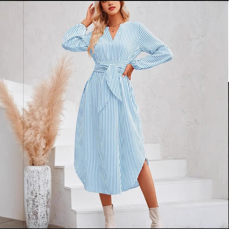 2025 クロスボーダー AliExpress Amazon 新作春夏エレガントオフィスレースアップスリムストライプドレス