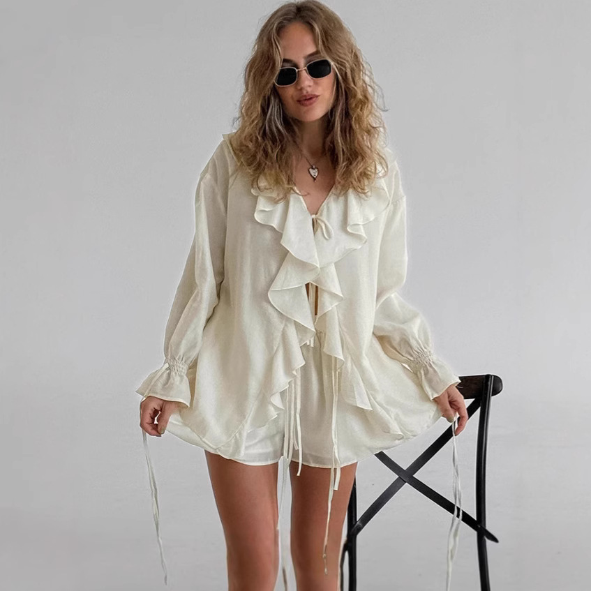 フレンチVネックルーズフリルシャツホットパンツスーツ2025春ヨーロッパとアメリカの新ファッションクロスボーダーツーピースセット