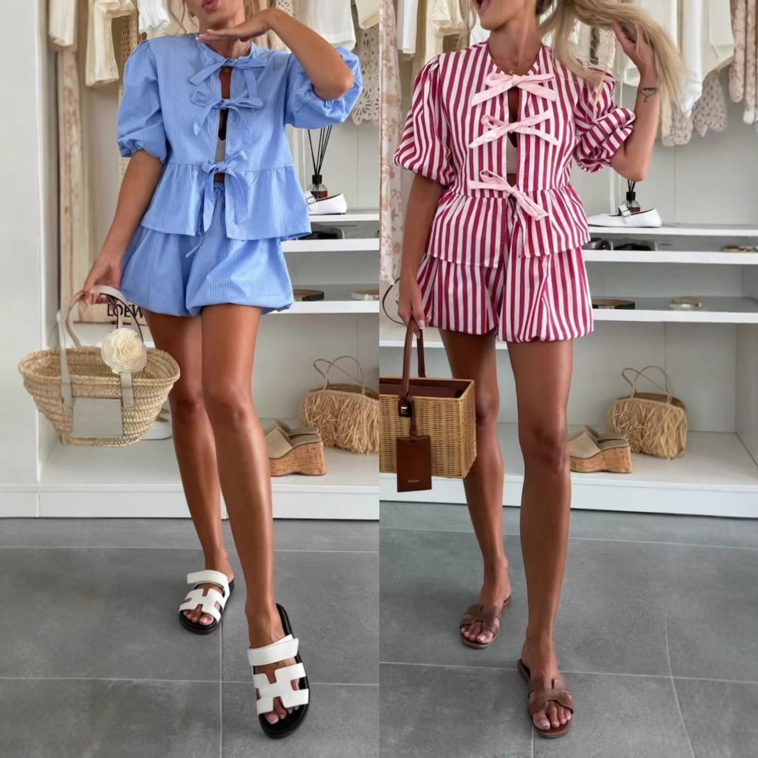 ヨーロッパとアメリカのクロスボーダー 2025 Amazon ファッションハイエンドレースアップランタンスリーブカーディガントップストライプショーツスーツ女性用