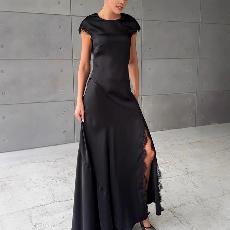2025 ヨーロッパとアメリカのクロスボーダー気質エレガントなパーティードレスサテンレース半袖スリットドレスレディースロングスカート