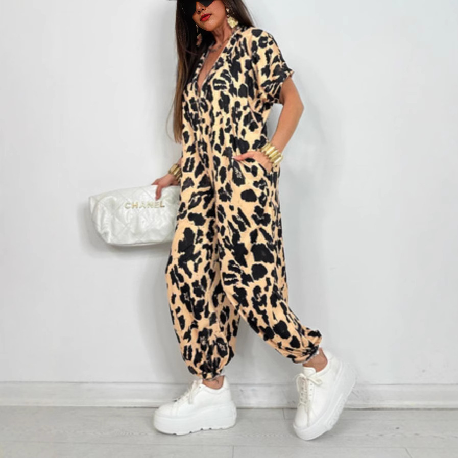 2025 中東クロスボーダー女性の夏のアマゾンクロスボーダーヒョウ柄プリントポケットジャンプスーツ無地カジュアルストレートパンツ