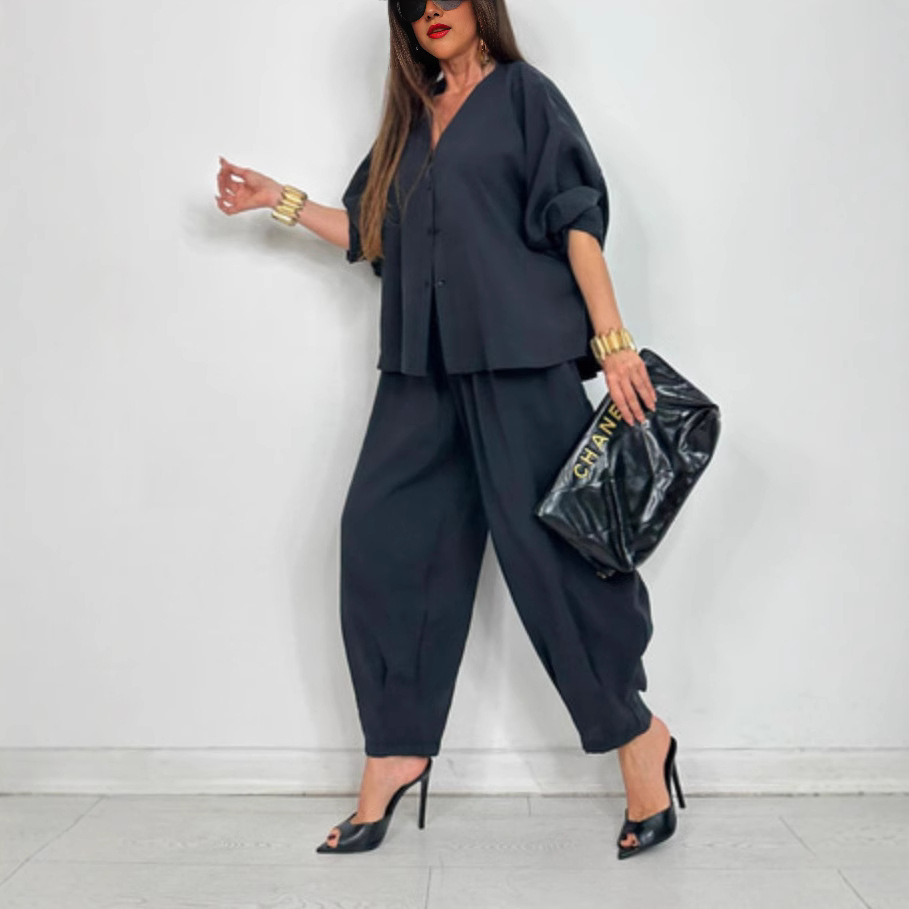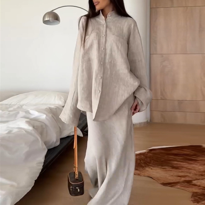 2025 中東クロスボーダーアマゾン綿とリネンカジュアルスーツ長袖シャツトップワイドレッグパンツツーピースセット卸売女性