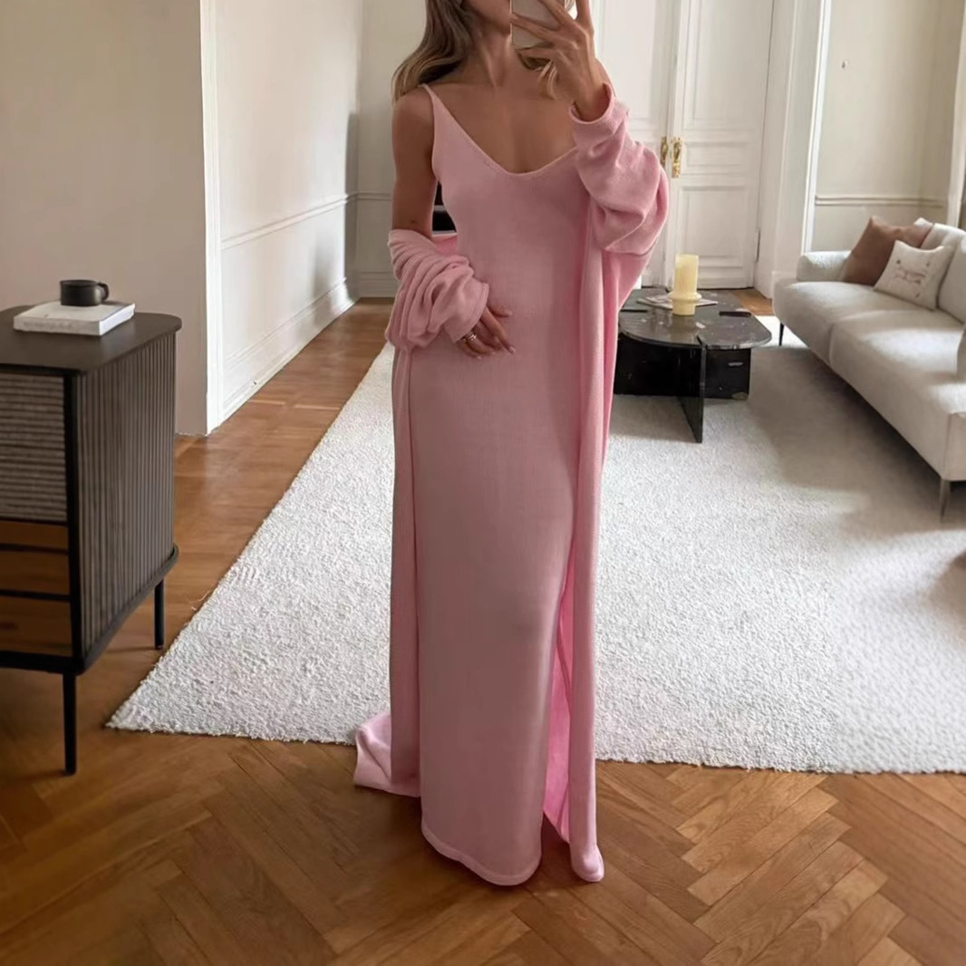 2025 ヨーロッパとアメリカの貿易アマゾンファッション無地 V ネック気質ニットヒップカバーロングスカートロングコートスーツ
