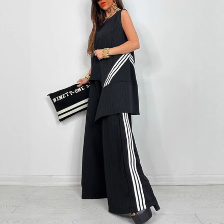中東クロスボーダーレディース2025ファッションカジュアルスーツストライプスプライシングノースリーブトップワイドレッグパンツ綿とリネンの2点セット