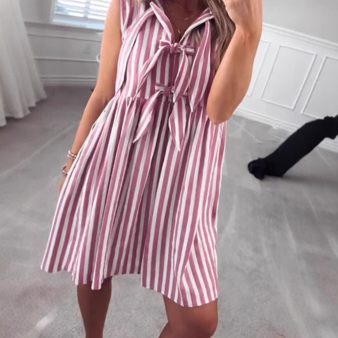 2025 ヨーロッパとアメリカンスタイルのクロスボーダー外国貿易新しいラペルドレスストライプノースリーブプルオーバーポケットスリム A ラインスカート女性