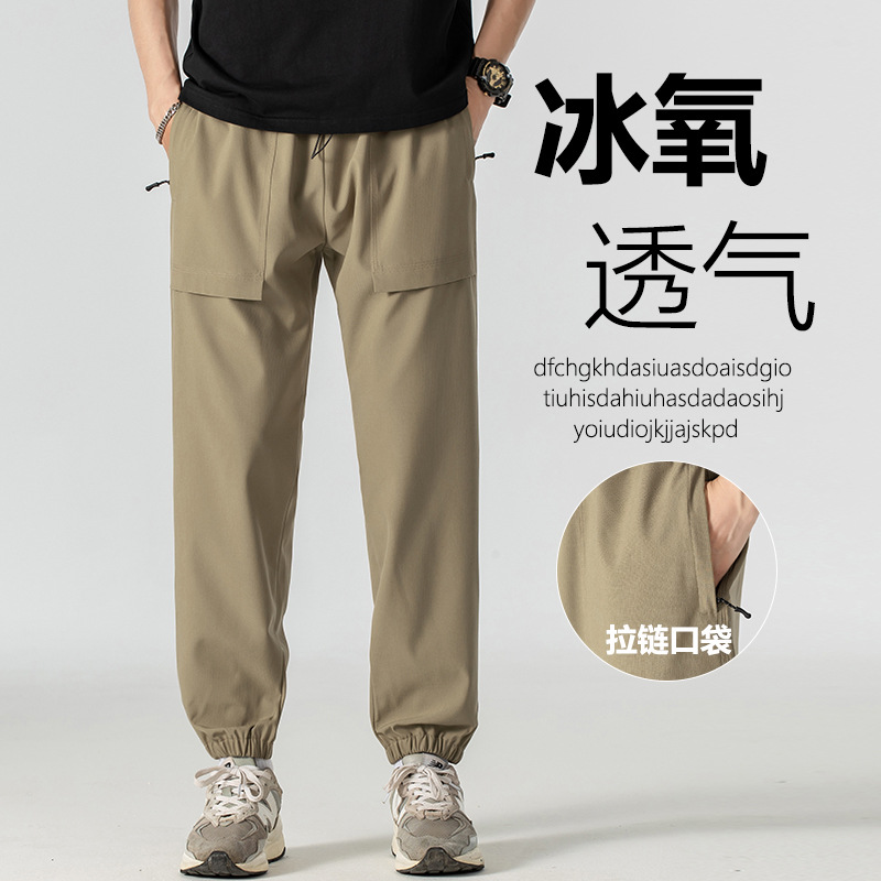 夏のシミターパンツ、アイスシルクカジュアルパンツ、メンズパラトルーパーパンツ、香港スタイルのルーズストレートワイドレッグパンツ、男性用マルチポケットオーバーオールパンツ