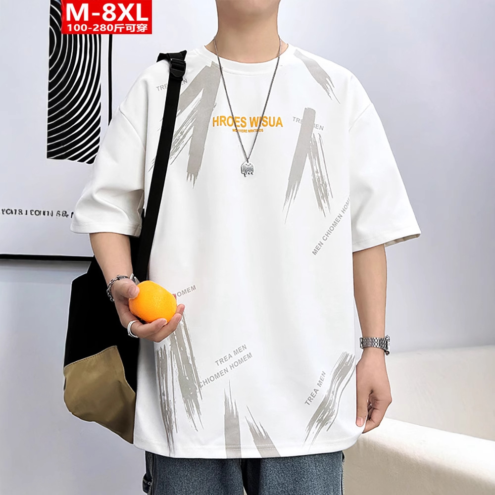 夏のトレンディな香港スタイルのメンズプリントラウンドネック半袖Tシャツ太った男性用プラスサイズのルーズソリッドカラーTシャツ
