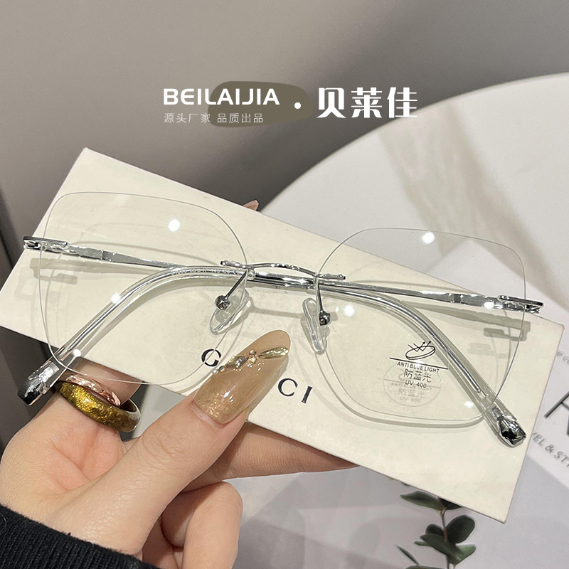 女性用多角形フレームレスエッジカットメガネフレーム、ネットセレブ、ピュアディザイアスタイル、超軽量メタルラージフレーム、ブルーライトカットメガネフレーム