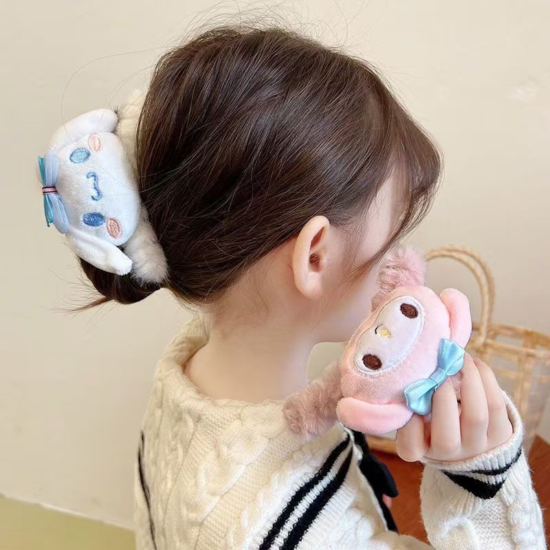 かわいいアニメのぬいぐるみが女性の後頭部を挟んでクリップの大きいサイズのサメのクリップの髪の量が多い