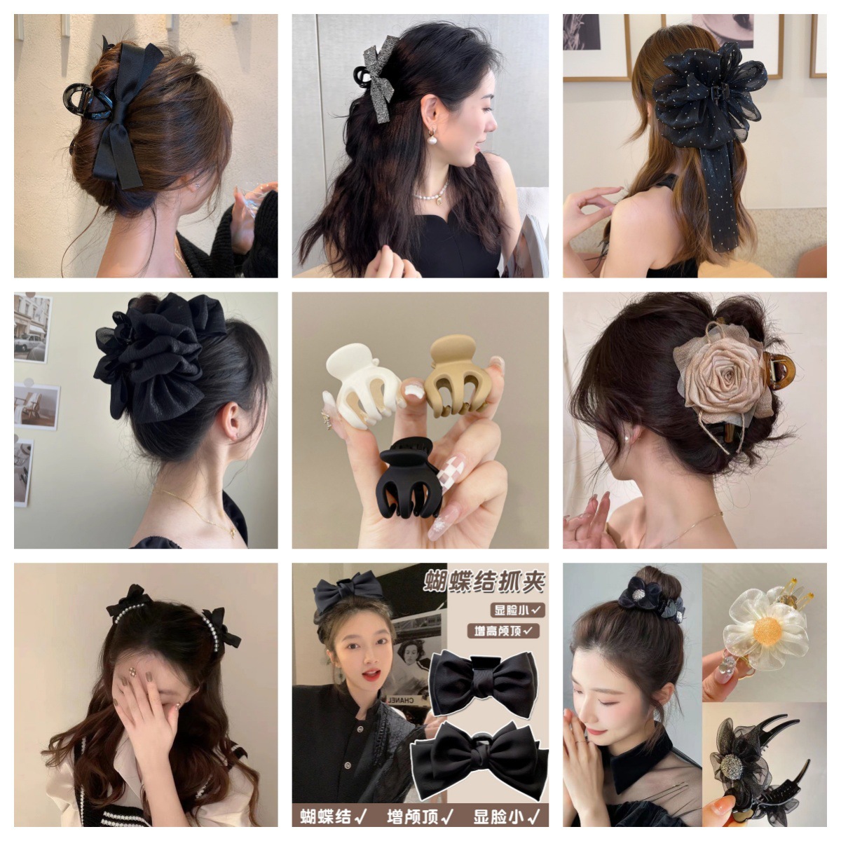 ヘボン風黒両面蝶結びクリップ女性大サイズ高級感ヘアピン盤髪後頭部サメクリップ飾り