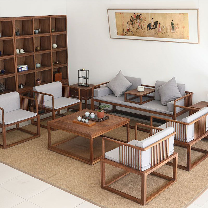 黒胡桃木実木ソファオフィスリビングルームの小戸型全実木新中国式ソファセット禅意布芸