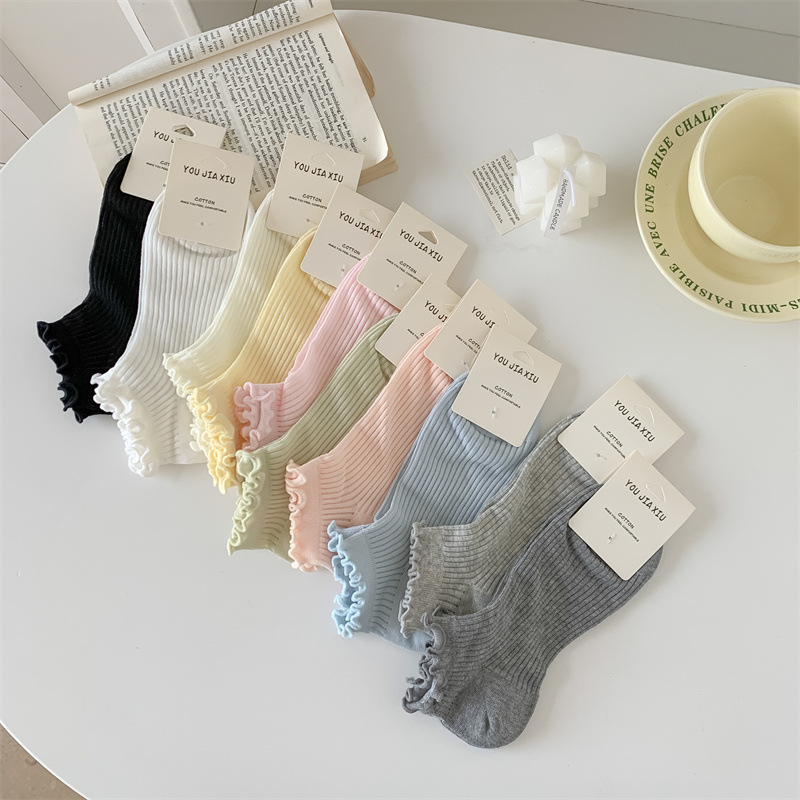 2025春夏の薄い純色の甘い木の耳の縁の網の目の船の靴下の超薄い通気性の一体機の骨のない短い筒の靴下