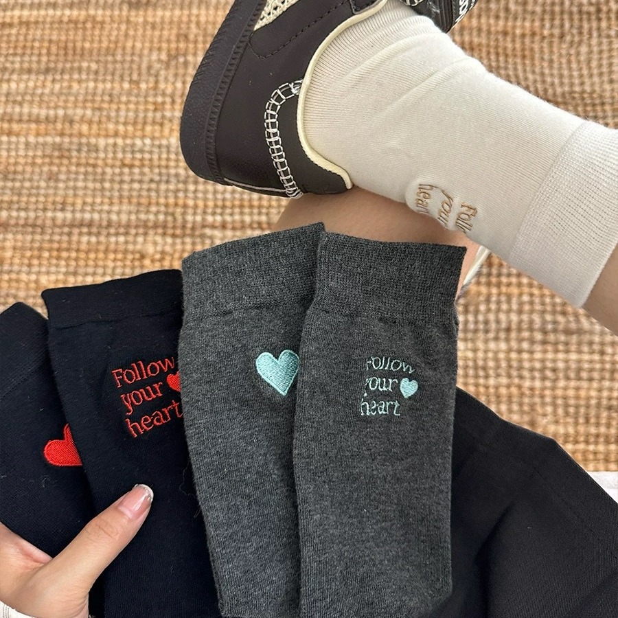 韓国系ins百合純色のかかと刺繍のアルファベットの中筒靴下春秋ファッション愛abタイプの少女が靴下を積んでいます。