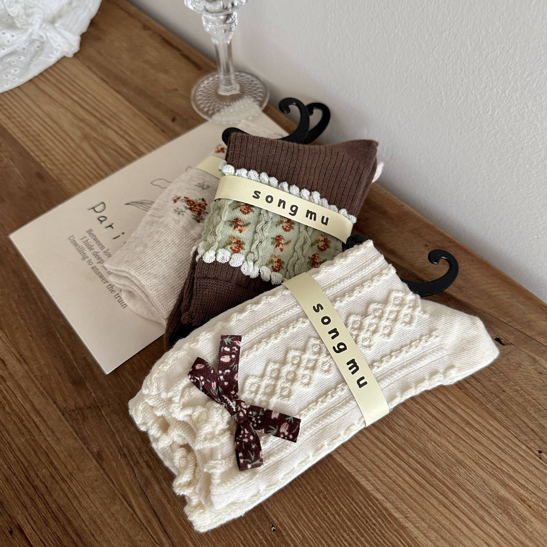 秋冬靴下子供緑野森系スタッキングソックスins復古風中筒靴下立体浮き彫りレース日系靴下