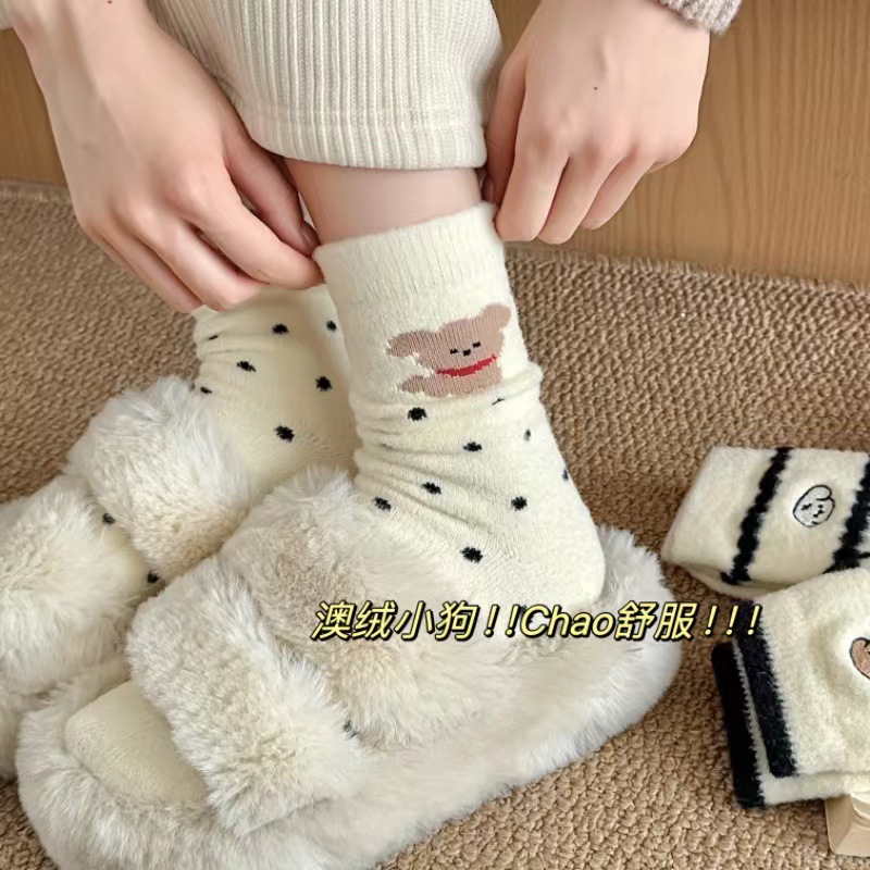 2024秋冬かわいい刺繍靴下ミンク茸保温縞中筒靴下秋冬子犬靴下女性新製品