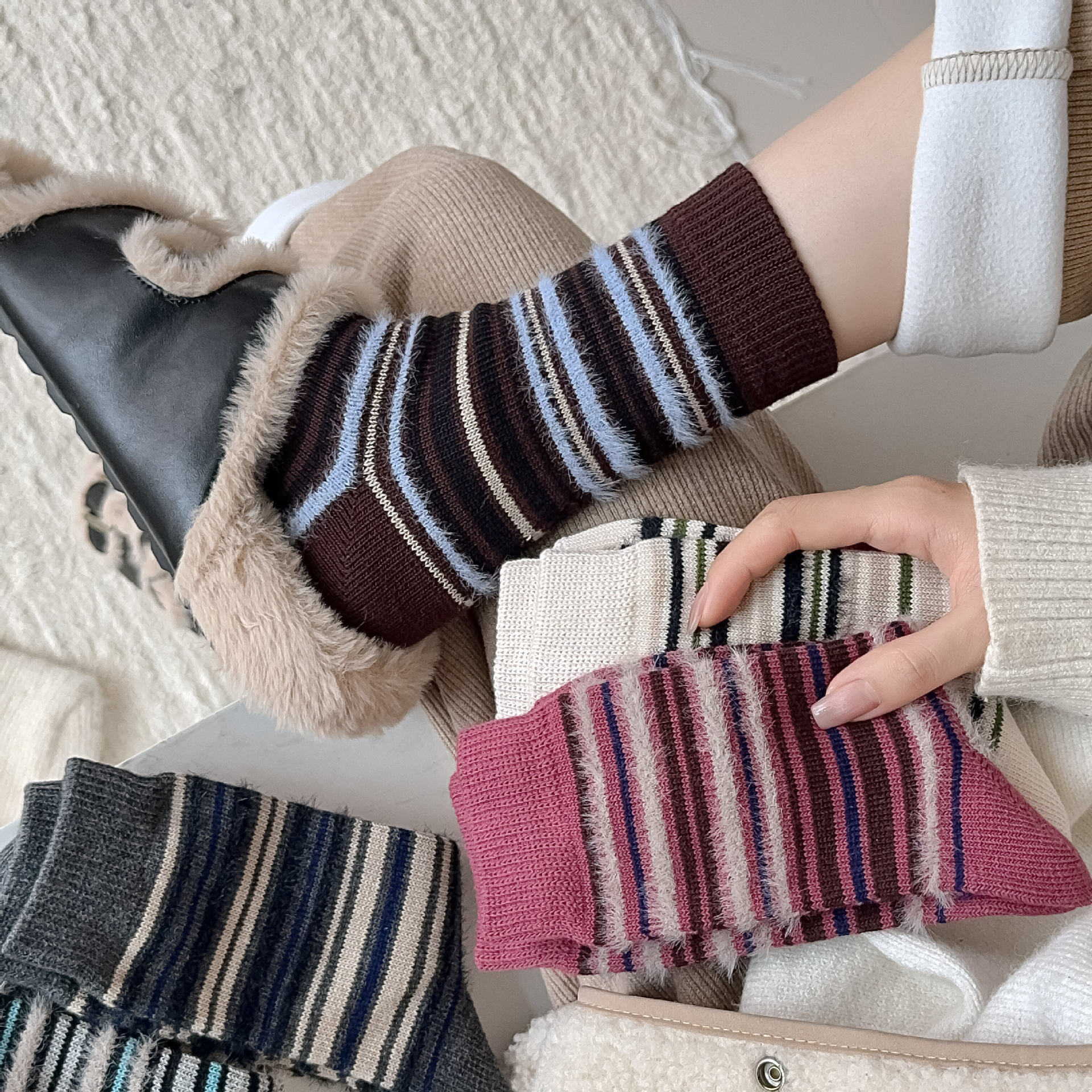 nayean Nanye パイルソックス ストレート ヒールなし マルチカラー カールソックス コーマ綿 親子ソックス 薄手 韓国風