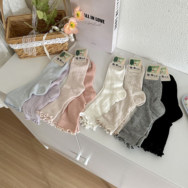 春と夏の新型のiu系の甘い風の女性の靴下の森系の木の耳元の透かし彫りのネットの目の女性の綿の靴下の中で筒の積み重ねの靴下