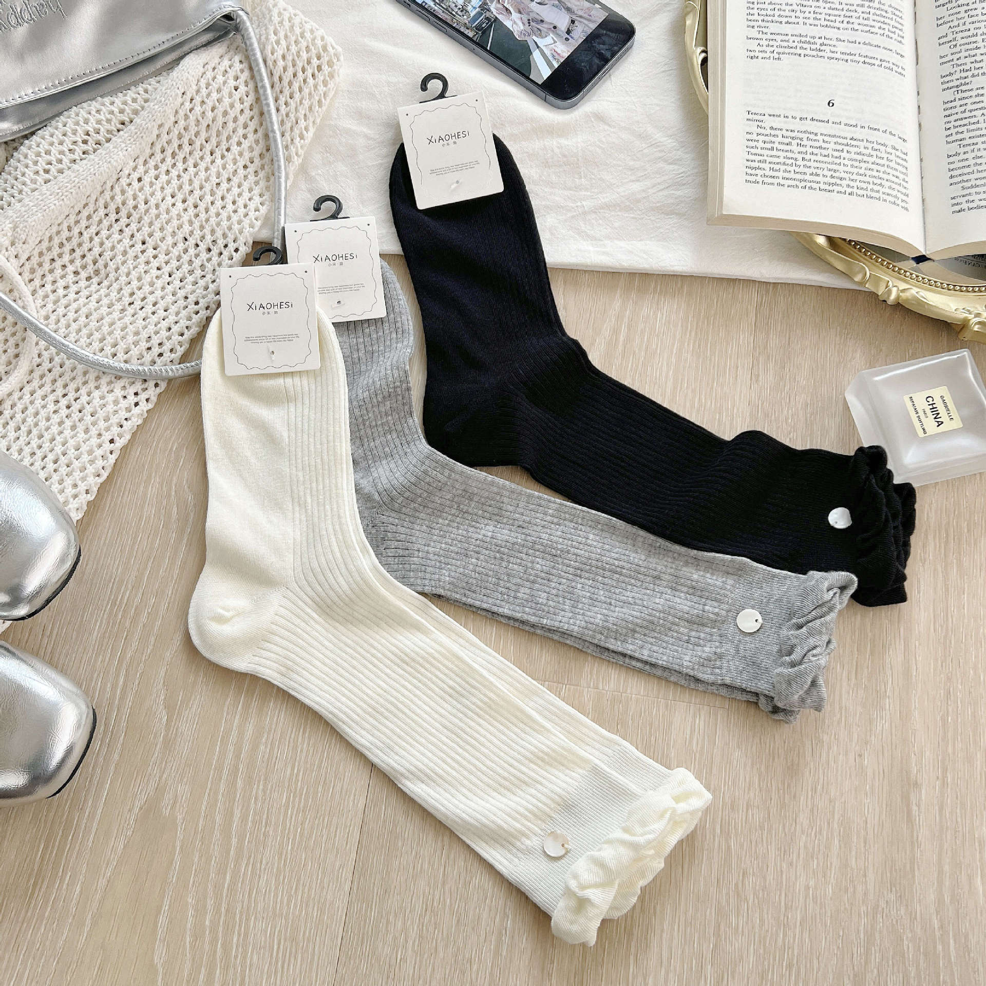 靴下春夏新品白靴下貝殻ボタン飾り純色女性靴下綿質学院風少女中筒靴下女性