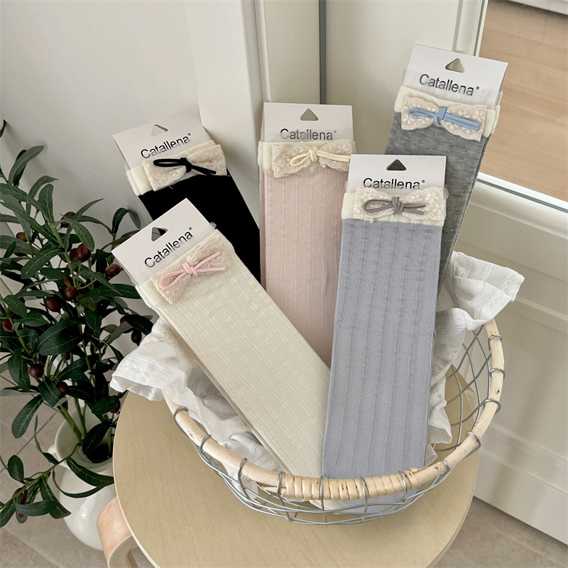 韓国ins格子小蝶結びリボン純色レース中筒スタッキングソックス子供可愛いロリータ靴下