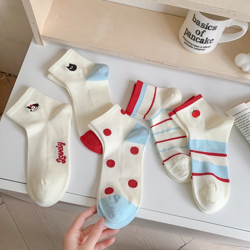 春夏のかわいいアニメの刺繍のリンゴの短い筒の女性の靴下の卸売りの百合は色の波にぶつかります。