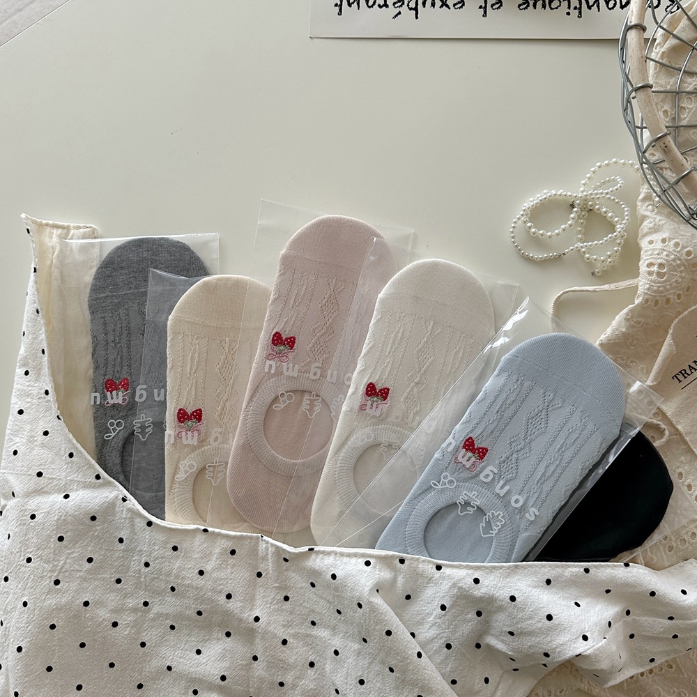 Songmu靴下クリーム色立体漫画子犬刺繍船靴下韓国系純色滑り止め隠れ靴下骨なし