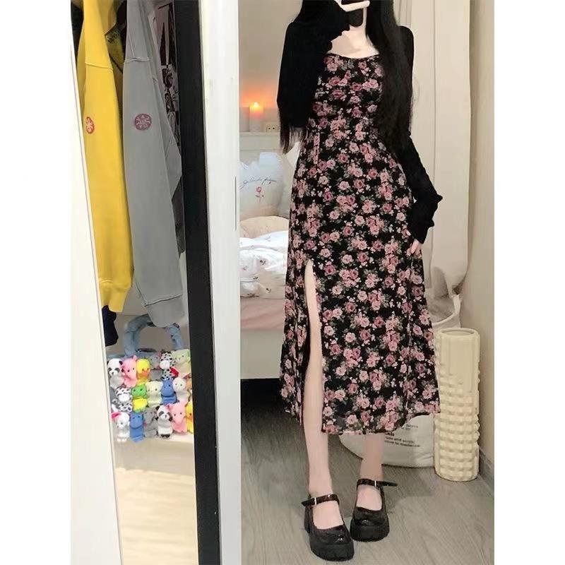 お姉さんの花のワンピースのスーツの女性の夏の修身のフォークのストラップの長いスカートの日焼け止めの長袖のカーディガンのコートの2つのセット
