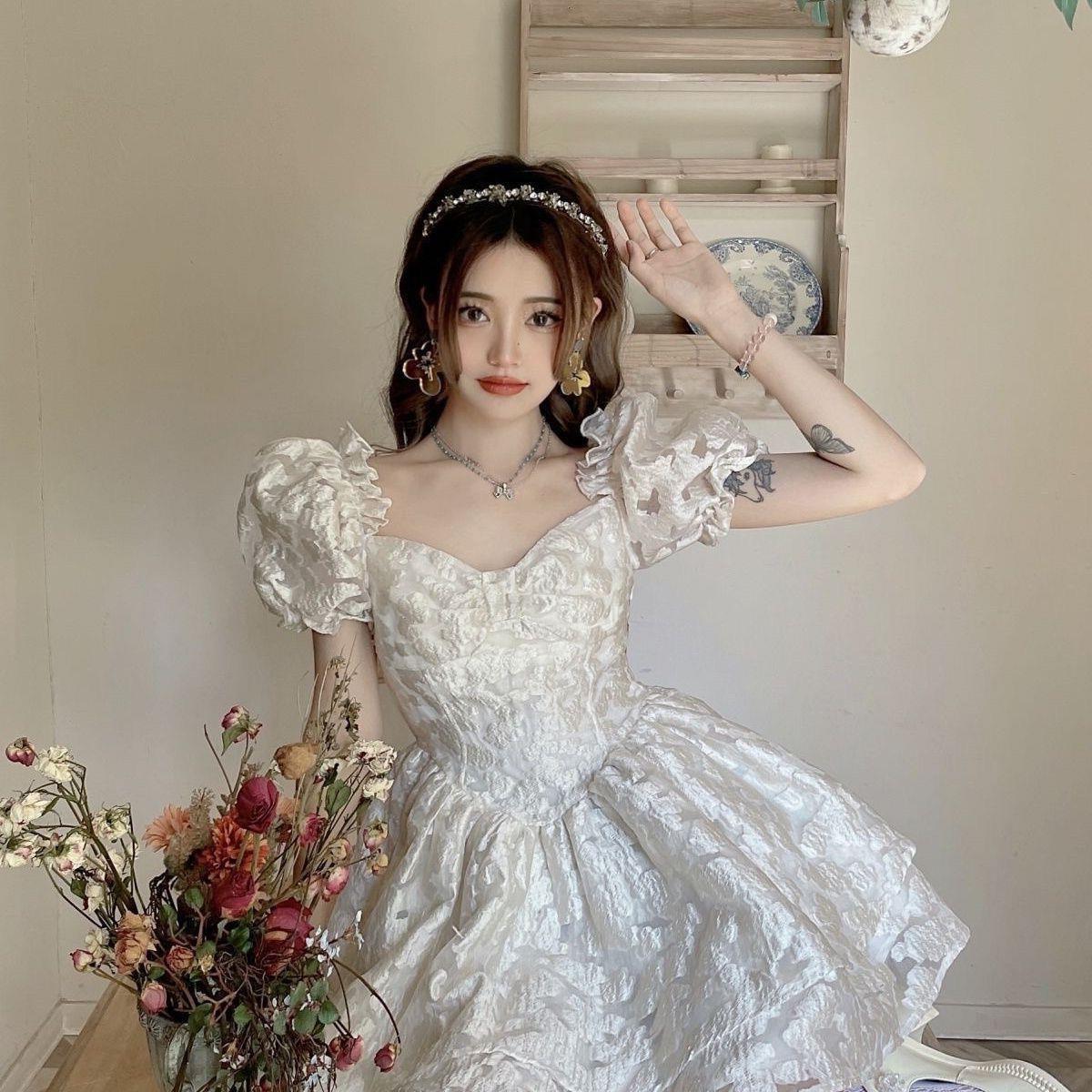 夏の森系フレンチワンピースの方襟の泡袖の魚の骨は腰のワンピースのジャカードの王女の純粋な欲の蓬のスカートを絞めます。