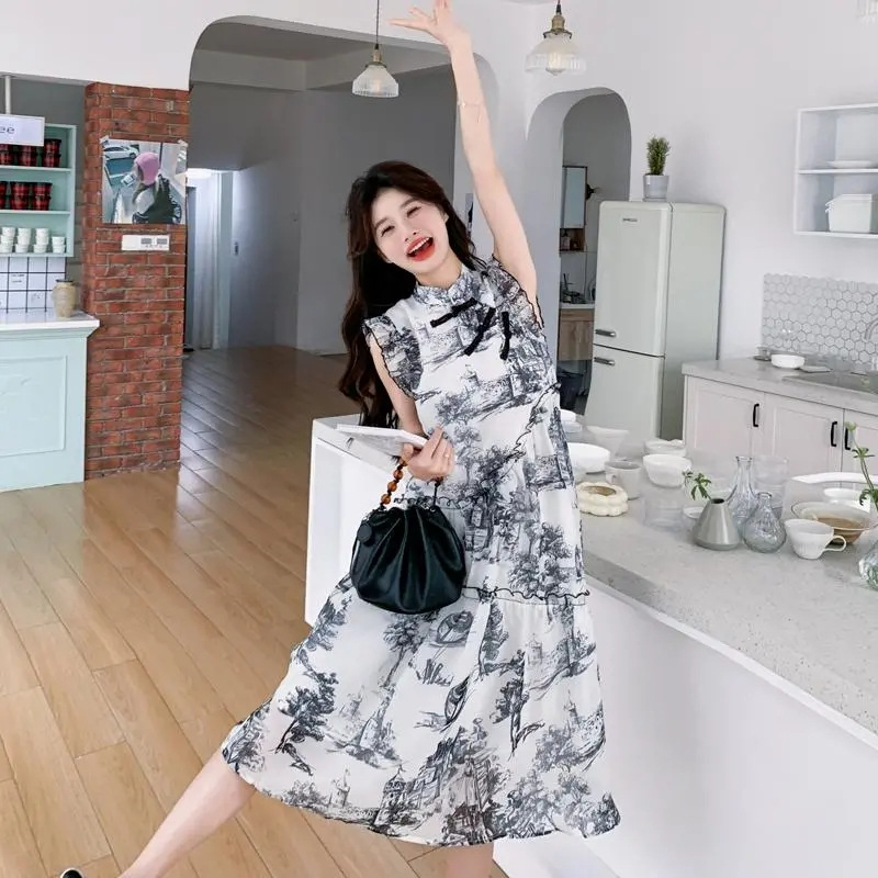 新中国風水墨画小飛袖ワンピース2024夏新作気質軽国風改良チャイナドレスゆったりスカート