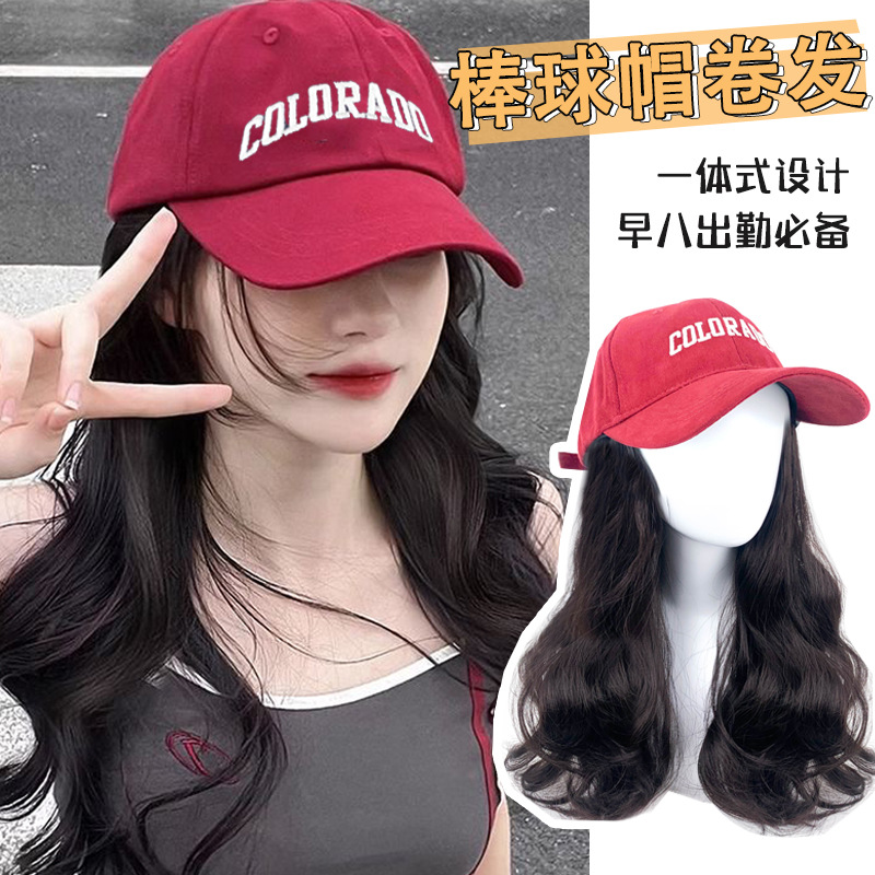(超顔小)帽子かつら一体女性大波長巻きネット赤野球帽カバー全頭頂