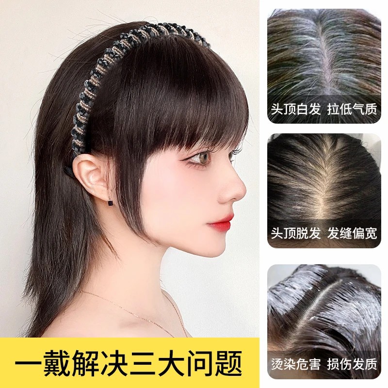 髪のカチューシャ前髪かつらの一体式の女性の額は白髪の頭の頂を覆います。