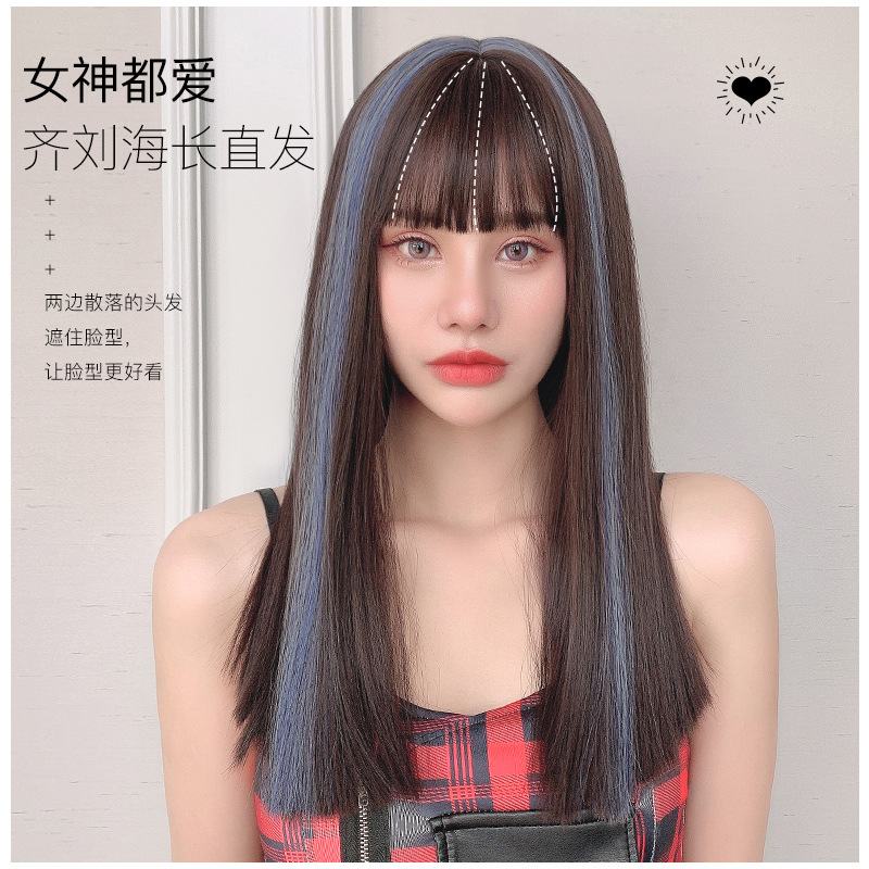 かつらの女性のロングストレートのネットの赤い刀は全部切って前髪の中の長い黒色のかつらのカバーを切ります。